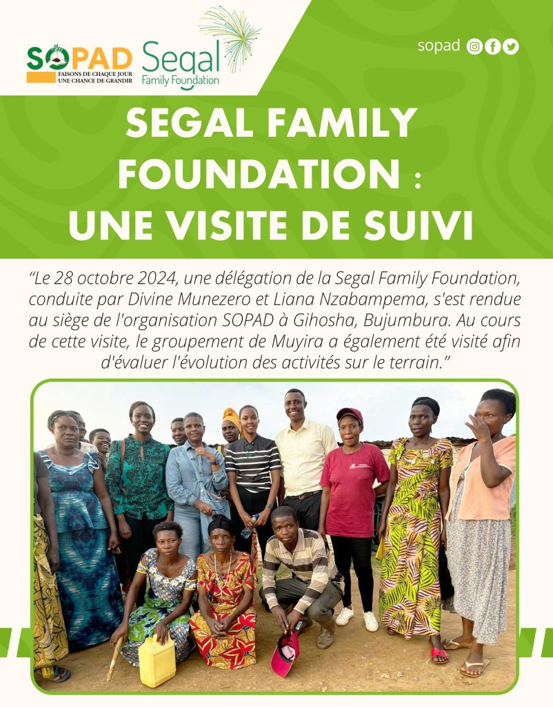 Le 28 octobre 2024, une délégation de la Segal Family Foundation, conduite par Divine Munezero et Liana Nzabampema, s’est rendue au siège de l’organisation SOPAD à Gihosha, Bujumbura. Au cours de cette visite, le groupement de Muyira a également été visité afin d’évaluer l’évolution des activités sur le terrain.